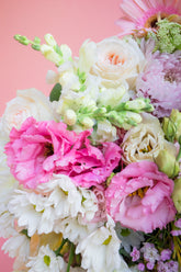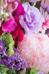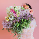 This soft and romantic bouquet is made from fresh seasonal flowers and features shades of pink, purple and white.